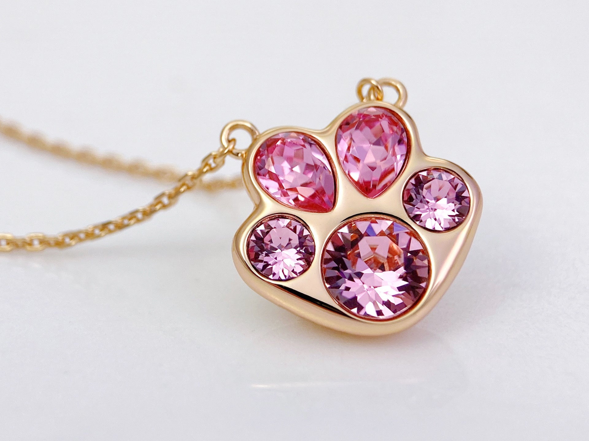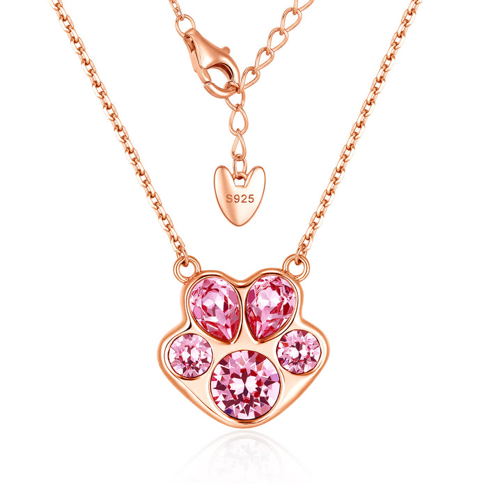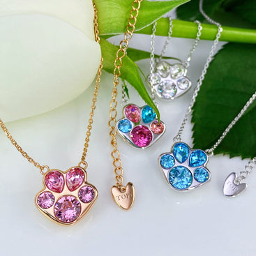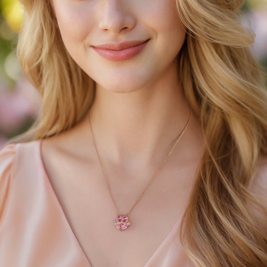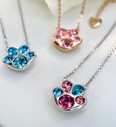 Pawssion is a sparkling pendant necklace designed as a fusion of dog's paw and cherry blossom. It symbolizes passion and vitality. Glamor is a pair of stud earrings featuring the graceful lines of a four-leaf clover, representing radiance and luck. A variety of colors is offered to complement your different styles.